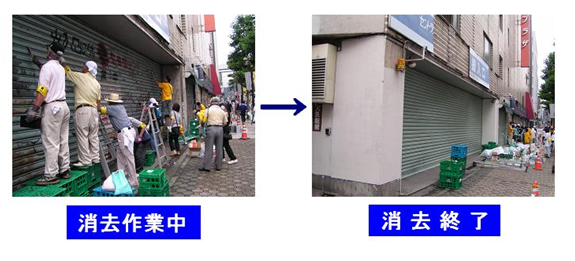 このことから、市は、落書き被害に遭った市民にとって大きな負担となっている、落書き消去活動に必要な「ペンキ」、「はく離剤」などを無償で提供するほか、安全で効率的に消去できるように、作業当日に専門の作業員を派遣して技術上の指導・助言を行います。