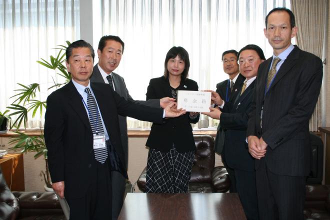 (財)日本ユニセフ協会千葉県支部に募金箱を手渡す市職員団体等の代表者ら