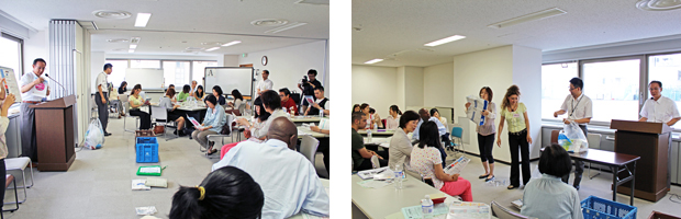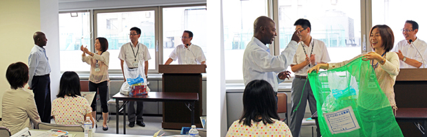 家庭ごみ手数料徴収制度は、参加者においては、すでにご存じの方が多く、家族や知人から聞いた、市政だよりの掲載記事で知った、千葉市国際交流協会で知った、とのことでした。また、ごみの出し方の実演では、実際に参加者にも加わっていただき、分別について考えました。