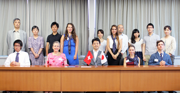 平成25(2013)年8月15日、青少年交流事業によりスイス・モントルー市から本市を訪れている青少年5人と引率者クリスティン・ビズさん、ホストファミリーの皆さんが、熊谷市長を訪れました。