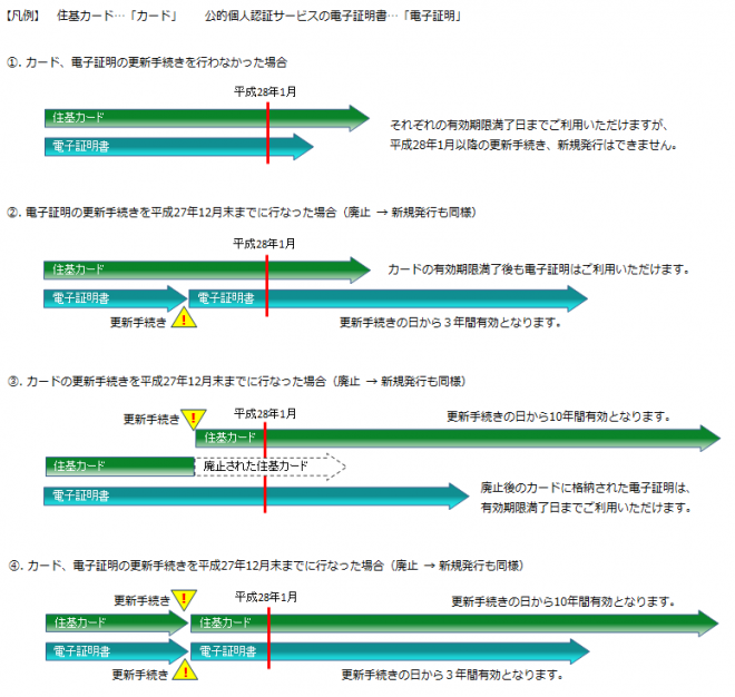 平成27年12月までに発行された住基カード及び住基カード用電子証明書は、平成28年1月以降も引き続き有効期限満了日までご利用いただけます。お持ちの住基カード及び住基カード用電子証明書の有効期限満了日に応じた有効期限は下記のとおりとなります。