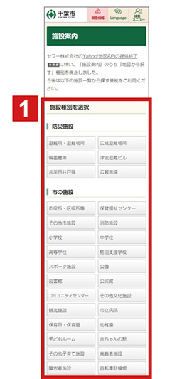 施設種別エリア 2 の種別項目から検索対象の施設のボタンをクリックします。