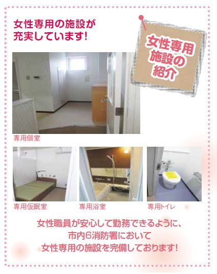 女性職員が安心して勤務できるように、市内6消防署1出張所において女性専用の施設を完備しております。