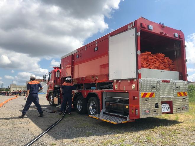 若葉消防署では、今年度運用開始した「遠距離送水車」の円滑かつ効率的な運用を図るため、訓練を行いました。