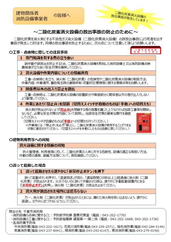 他都市において、二酸化炭素を消火剤とする不活性ガス消火設備(二酸化炭素消火設備)の誤放出による事故が発生し、死傷者が発生しています。