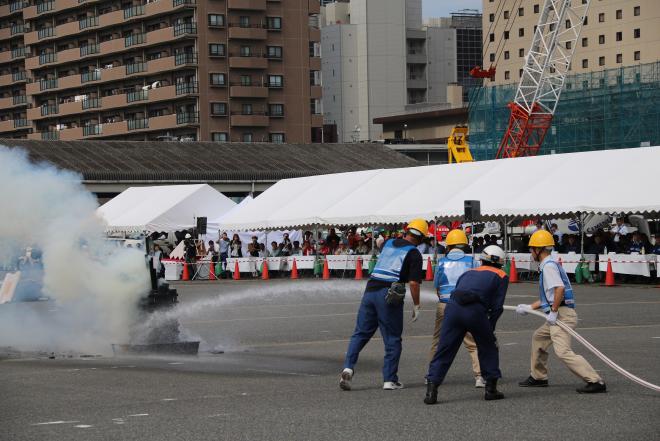 主会場となる、中央区の千葉市役所では、本部員会議訓練をはじめ、災害時応援協定を締結した、千葉中央生コンクリート協同組合とのミキサー車による消防用水確保訓練、JFEスチール(株)東日本製鉄所及び東日本電信電話(株)千葉事業部との電源供給訓練など新たな訓練を実施しました。