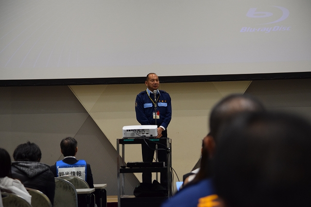 通信訓練でとりまとめられた対応状況票をもとに、交通機関の運行状況や一時滞在施設の開設状況などを、帰宅困難者に情報提供する訓練を行いました。特に、障害者の方や外国人の方へどのように情報を伝えるかということで、JRの駅員がタブレットを用いた聴覚障害者への筆談対応や、観光情報センター職員による外国人対応などを行いました。