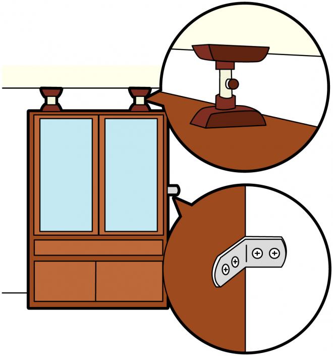 転倒防止金具などで壁に固定し、家具を倒れにくくする。