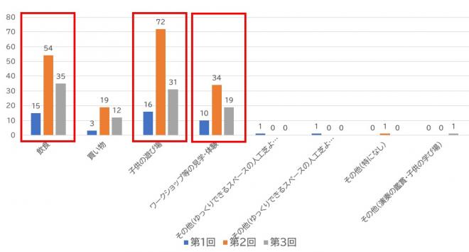「子供の遊び場」 「飲食」 「ワークショップ等の体験」との回答が多い。