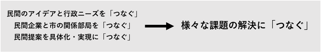 関係部局と連携しながら、様々なモノ・コトを「つなぐ」(CONNECT=コネクト)ことで、民間提案の実現をサポートします。