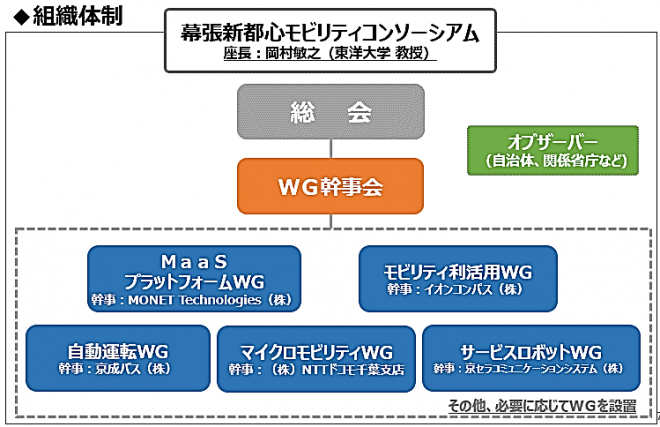 本市では、これまで幕張新都心において自動運転モビリティや電動キックボードなどの実証実験を実施してきましたが、2021年2月に、企業、大学、住民及び行政の連携により、多様な主体による新たなモビリティサービスを実現し、地域の移動課題への対応や回遊性の向上、地域の活性化を通じて持続可能な都市づくりを目指す「幕張新都心モビリティコンソーシアム」を設立しました。