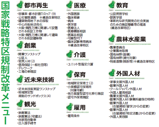 国家戦略特区では「都市再生」をはじめ、幅広い分野の規制改革メニューが用意されています。