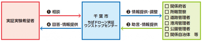 ドローンの実証実験を促進することにより、ドローン利活用の早期本格化を図るため、実証実験を実施しようとする民間企業に対し、関係法令上の必要な手続きに関する情報提供や相談、関係機関等との調整などをワンストップで支援しています。
