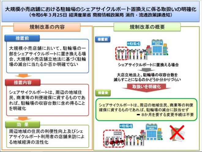 本市の提案を踏まえ、令和6年3月25日経済産業省商務情報政策局消費・流通政策課号通知が出され、駐輪場の一部をシェアサイクルポートに置き換える場合、シェアサイクルポートが周辺の地域住民、商業等の利便確保に資するものであれば、駐輪場の収容台数に含めることができる旨明確化しました。