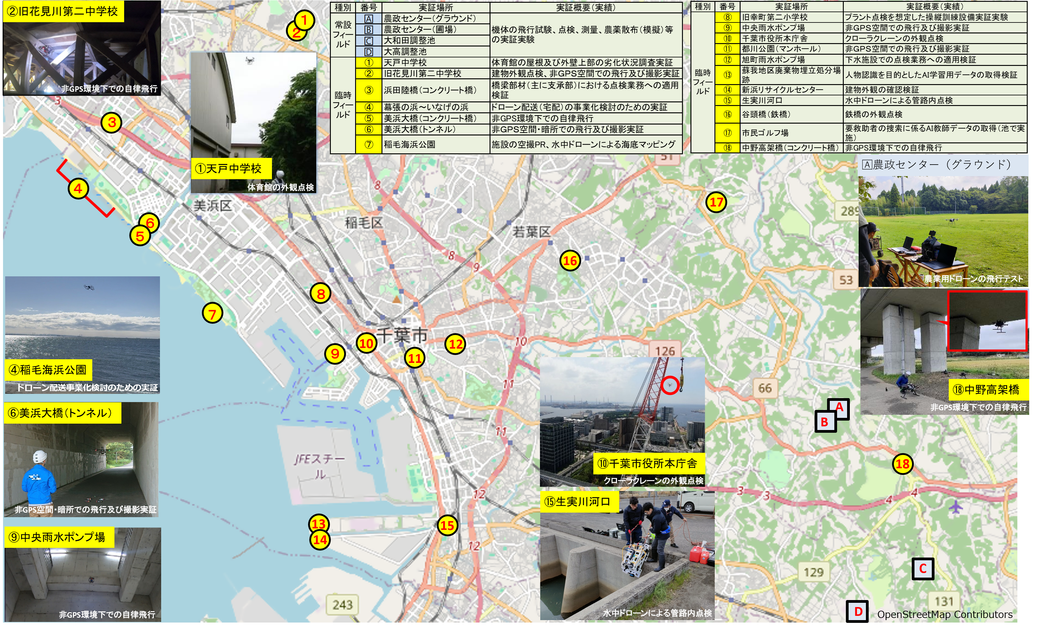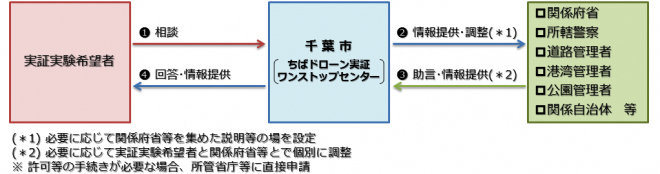 「ちばドローン実証ワンストップセンター」は、ドローンの実証実験を促進することにより、ドローン利活用の早期本格化を図るため、実証実験を実施しようとする事業者に対し、必要な手続きに関する情報提供や相談、関係機関等との調整などをワンストップで支援する、国と千葉市が共同で設置したセンターです。