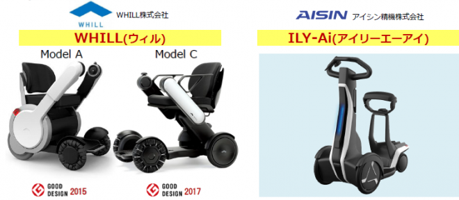 【画像左から】株式会社WHILLが開発する「WHILL(ウィル)」ModelA/C、株式会社アイシンが開発する「ILY-Ai(アイリーエーアイ)」