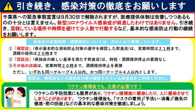 千葉県を含む19都道府県の緊急事態措置が9月30日をもって解除されることになりました。千葉市の新規陽性者数はステージ2の水準まで減少し、療養者数など他の基準も改善傾向にあって今回の解除は妥当と考えています。これまでの市民の皆様、事業者の方々のご理解ご協力によるもので感謝します。
