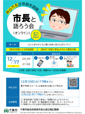 「ひととまちがともに輝く未来に向けたまちづくり」をテーマに、市長が参加者とオンライン会議ツール「Zoom」を使って直接意見交換を行います。