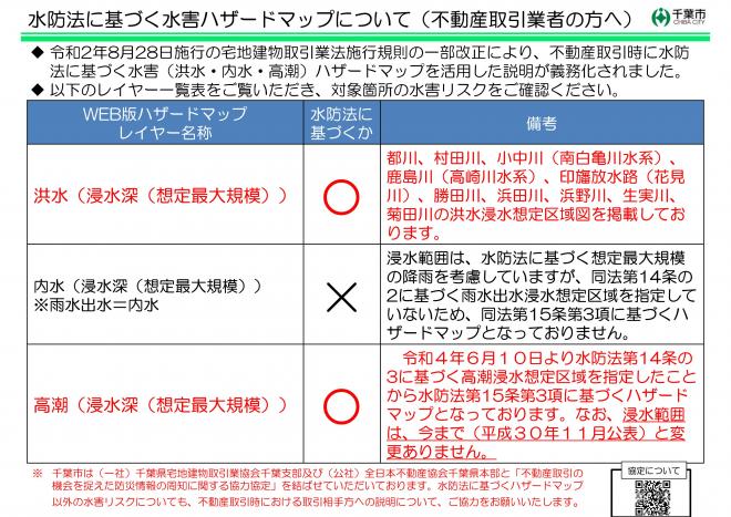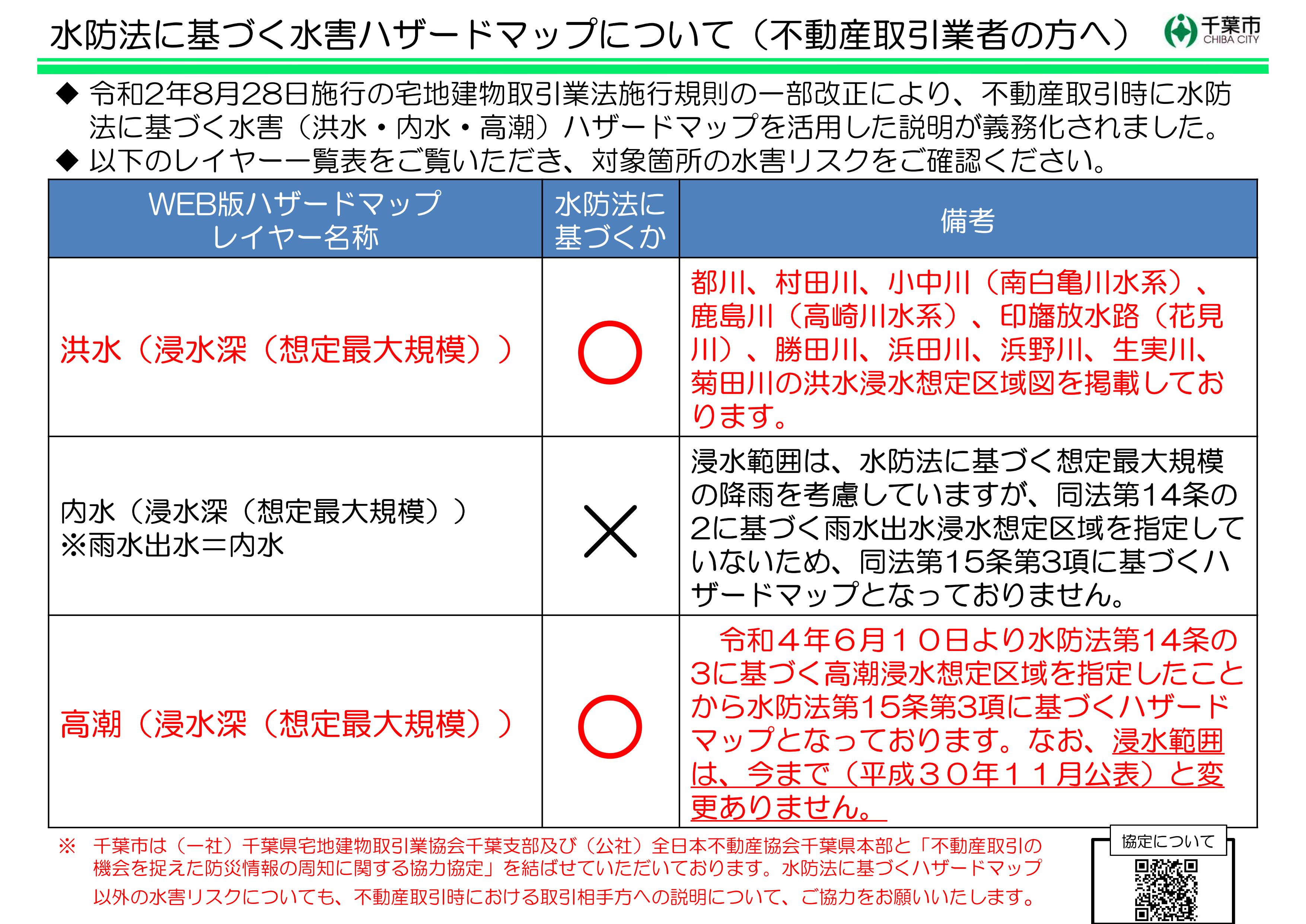 なお、千葉市は(一社)千葉県宅地建物取引業協会千葉支部及び(公社)全日本不動産協会千葉県本部と「不動産取引の機会を捉えた防災情報の周知に関する協力協定」を結ばせていただいております。水防法に基づくハザードマップ以外の水害リスクについても、不動産取引時における取引相手方への説明について、ご協力をお願いいたします。