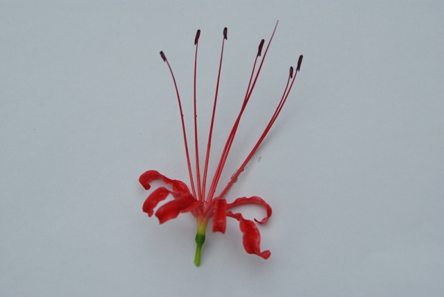ヒガンバナは、花茎の先に普通6個の花を付けます。花被(花びら)はリボン状で縮れており、雄しべと雌しべは蜘蛛の足のように長く飛び出ています。1つの花には花被が6枚、雌しべ1本、雄しべ6本があります。雄しべと雌しべの見分けが付きにくいですが、よく観察すると「雌しべは雄しべより少し長い。雄しべの先端には葯がある」ことで見分けられます。