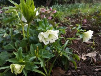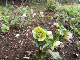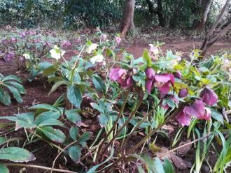 クリスマスローズ花壇も、花盛りです。花から種をとって育てた苗で、一重の花、八重の花、赤い花、白い花、グラデーションの花など、いろいろな花があり、見ていて飽きがありません。