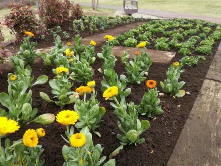 先月植え付けたキンセンカやビオラが根付き、花が上がってきました。