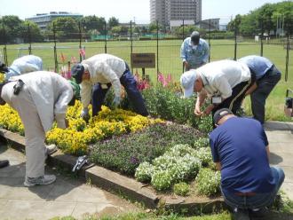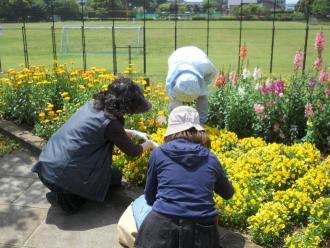 また、新たに、近くの植樹帯の空いているスペースに花の会で花を植えようということで、花島公園を管理している(有)花島公園協力会に土を掘り起こしてもらいました。掘り起こしてもらった土には、雑草の根っこがたくさん。皆で掃除をし、植え付けの準備をします。