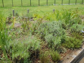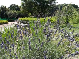 センター奥側の花壇では、ラベンダーがきれいに咲いています。風が強く育ちにくい場所ですが、今年はよく花を咲かせて、涼やかさを与えてくれています。
