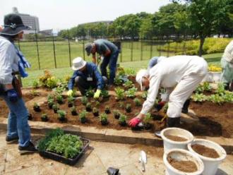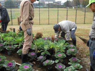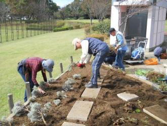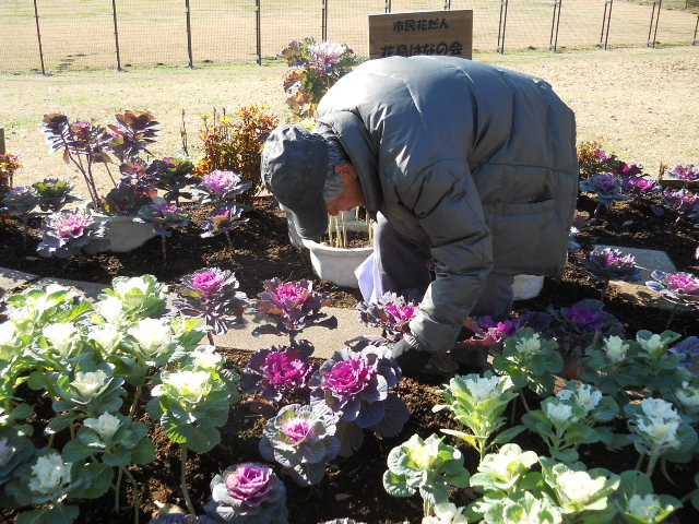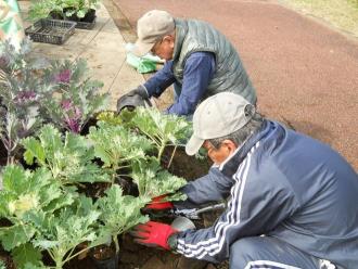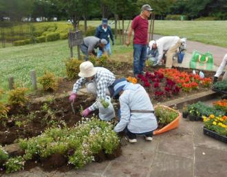 本日は、センター奥側花壇の植え付けを行いました。先月苗を堀り上げた花壇は、この一か月の間に花島公園を管理している(有)花島公園協力会の協力で、園内でできた腐葉土をすきこみ、やせた土を改良しました。