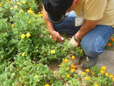 本日の作業のメインは、マリーゴールドの切り戻しです。マリーゴールドの花を一度切り詰めます。そうすることで、枝が更新され、長く花を持たせることができます。