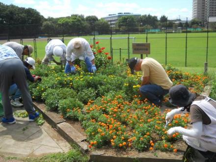 センター手前の花壇は、マリーゴールドの手入れをしました。先日の台風の潮風の影響をマリーゴールドも受けて枯れた苗もありましたが、枯れた部分を除去をして、明るい花壇になりました。