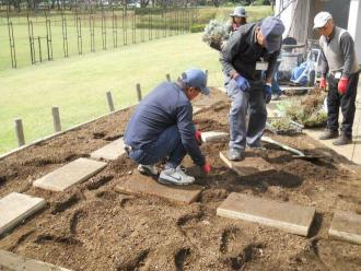 通路となる平板をしき、メンバーで知恵を出し合って決めた配置で、植え付けを行っていきます。