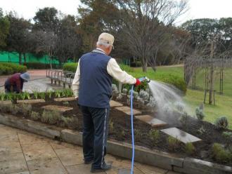 無事、植え付けが終わり、水やりをして仕上げです。来年の春には花が咲き、新しい顔を見せてくれるのが楽しみです。
