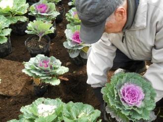 ハボタンの色と葉の形で、デザインを決めて、調整しながら配置して植えつけました。