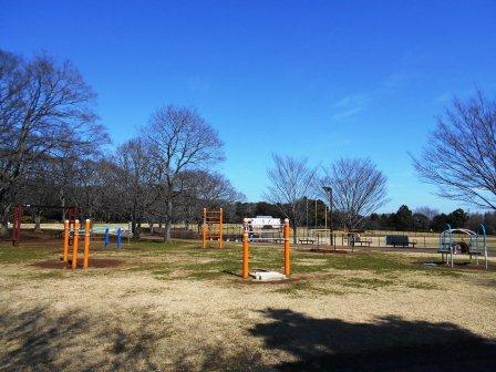 芝生広場の一角には、背伸ばしベンチや懸垂用の鉄棒など健康遊具7基が設置されています。