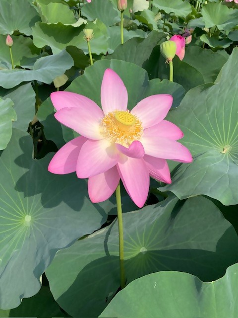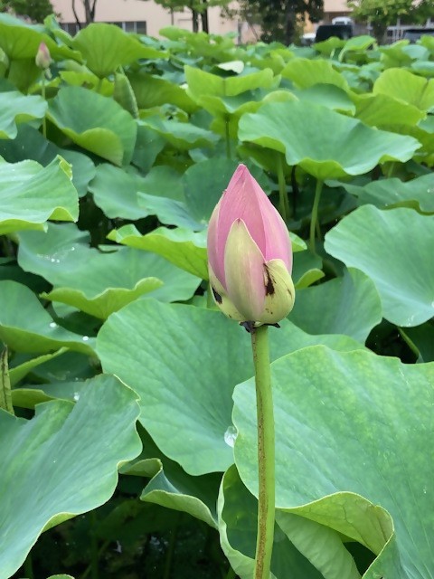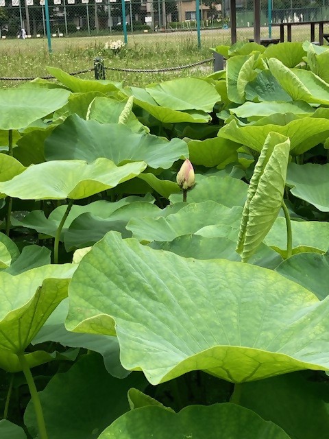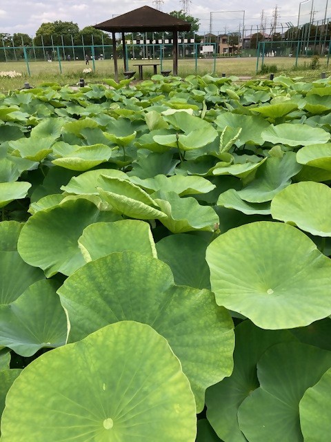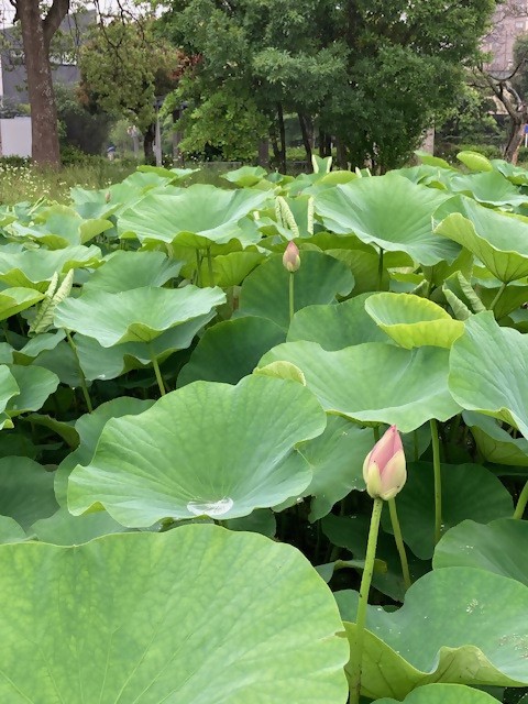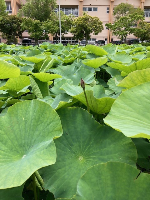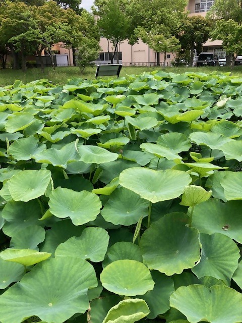 今年のハス池の様子をお伝えします。立葉を越えて花蕾が目立つようになってきました。開花までもうしばらくお待ちください。