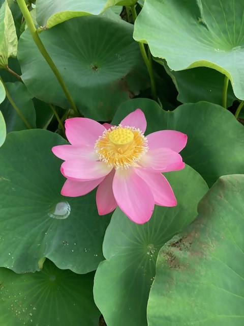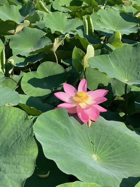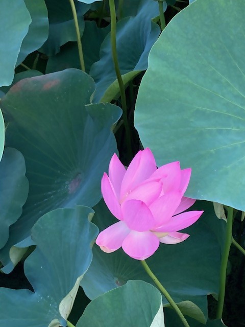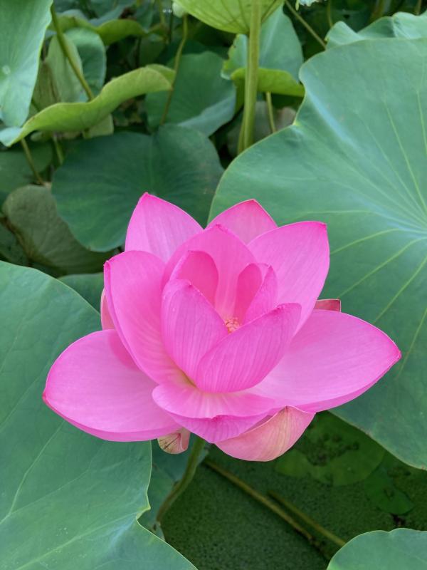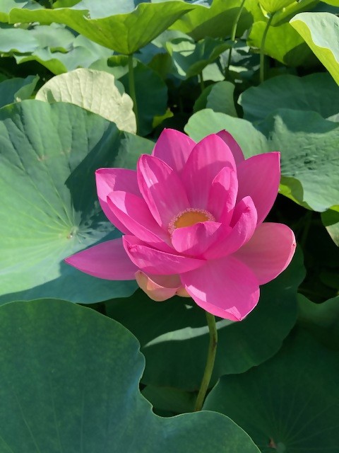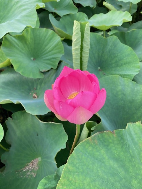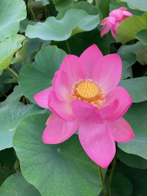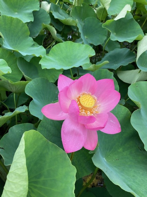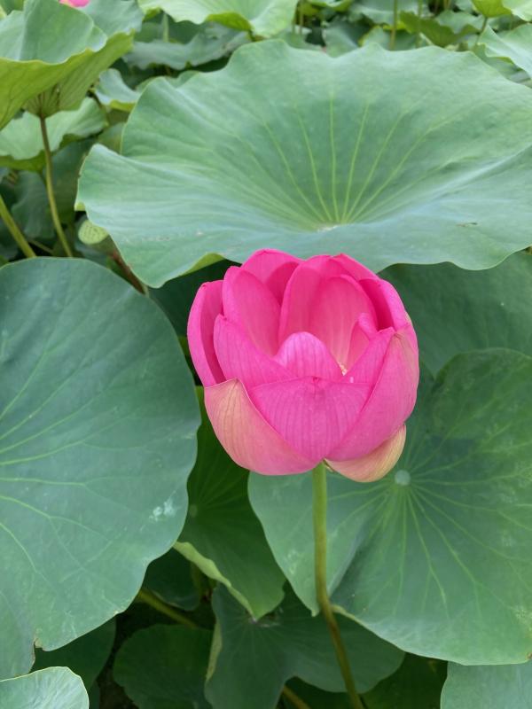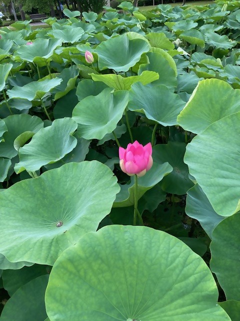 園内、午前6時ころの様子です。鮮やかなピンク色をした「とっくり型」の花を6つほど咲かせていました。いよいよ開花、オオガハスの季節となってきました。
