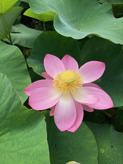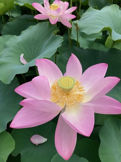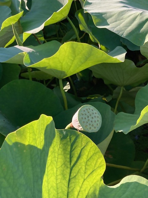 園内、午前6時過ぎの様子です。葉と花が風に揺れて思うように写真に収めることができませんでしたが、花托も含めて様々な様子を見ることができました。
