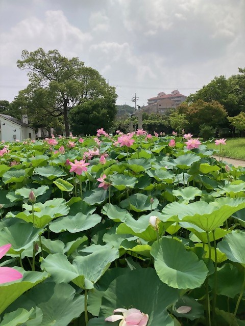 園内、午前7時半頃の様子です。多くの花とつぼみで池は賑やかなものとなっています。