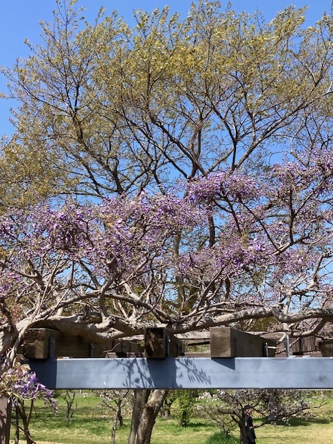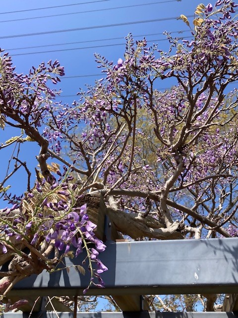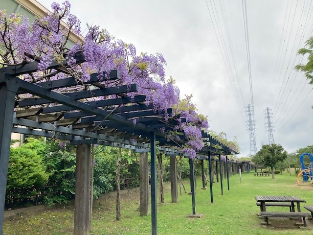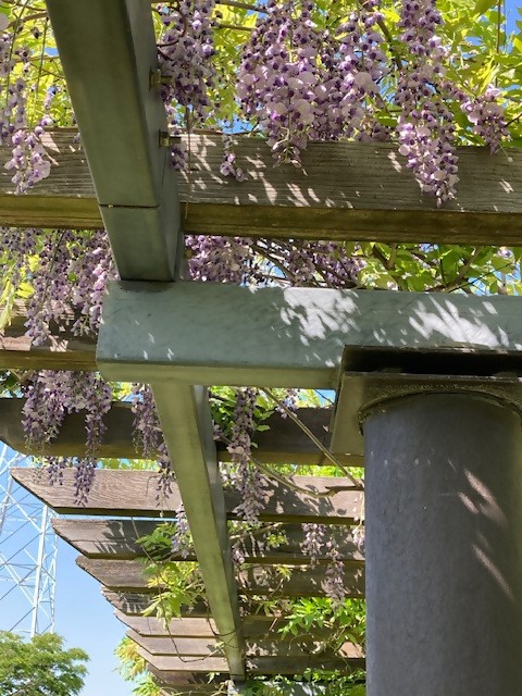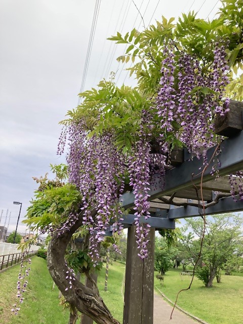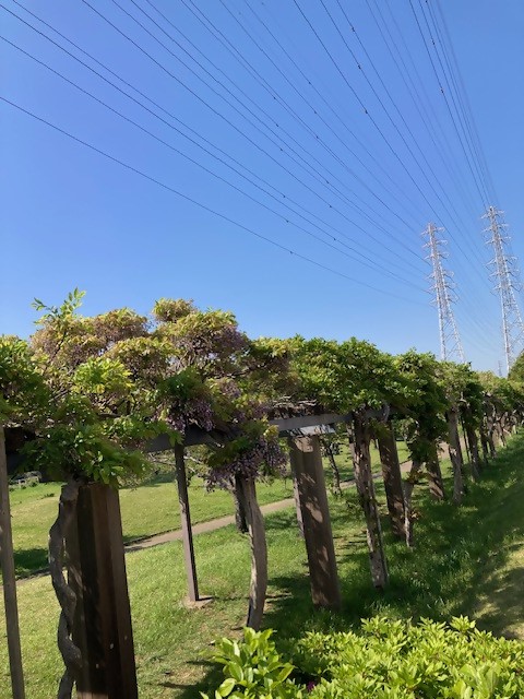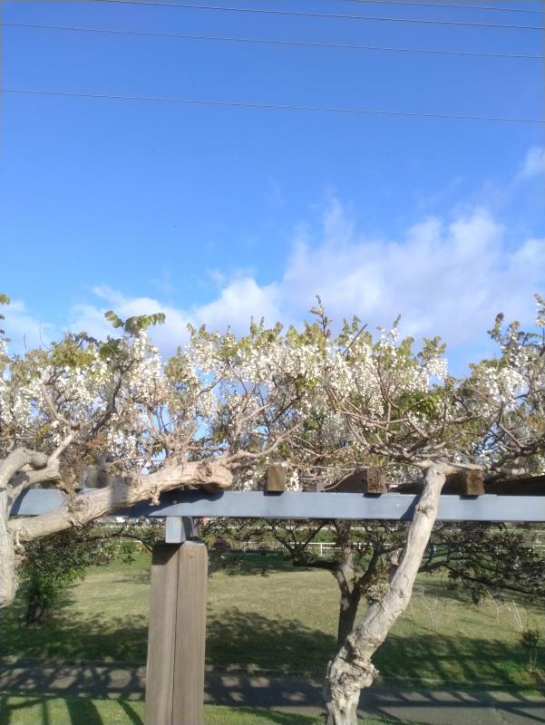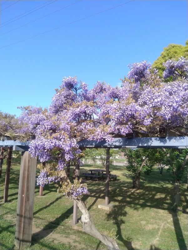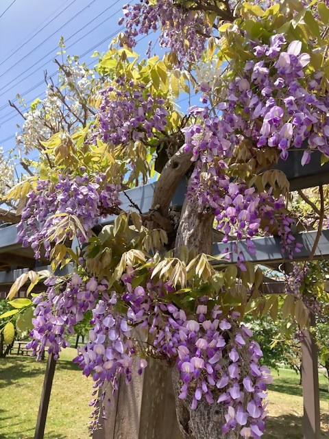 フジの花が見頃を迎えています。紫と白が鮮やかで青空に良く映えます。