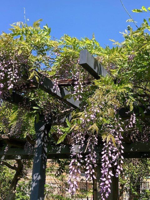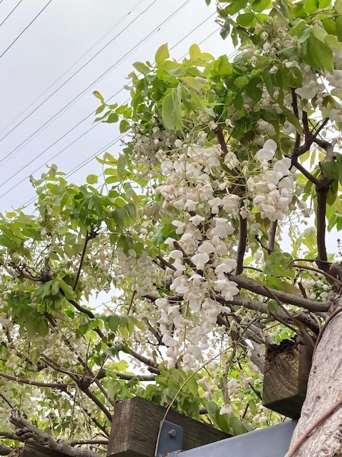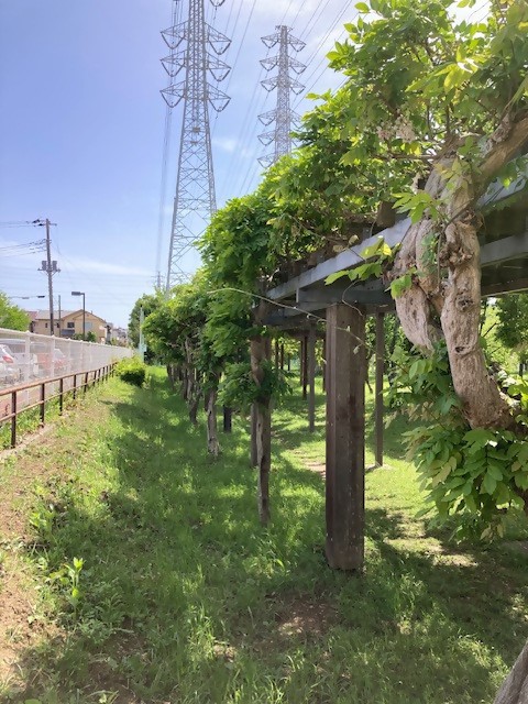 先日の強い雨で花は落ち、緑の藤棚となりました。これで今シーズンのフジのお知らせは終了となります。