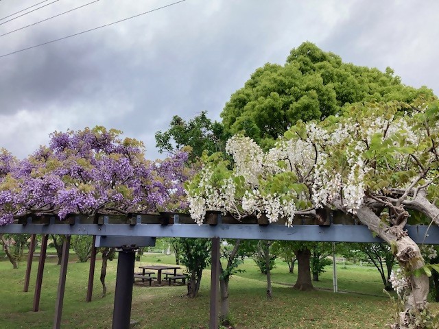 フジの花が咲き始めました。紫と白のフジの花をご覧いただけます。