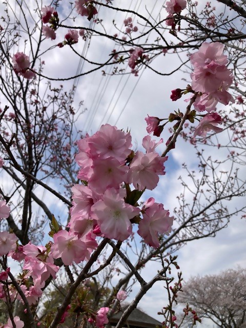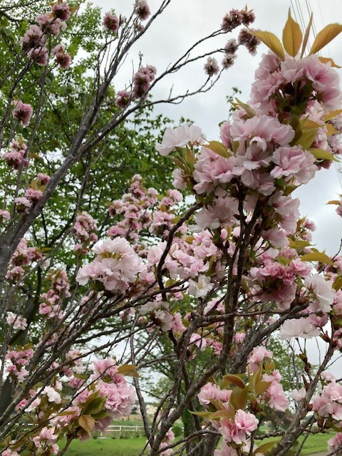葉桜になってきました。風に舞う花びらがきれいです。八重桜はまだ見頃です。