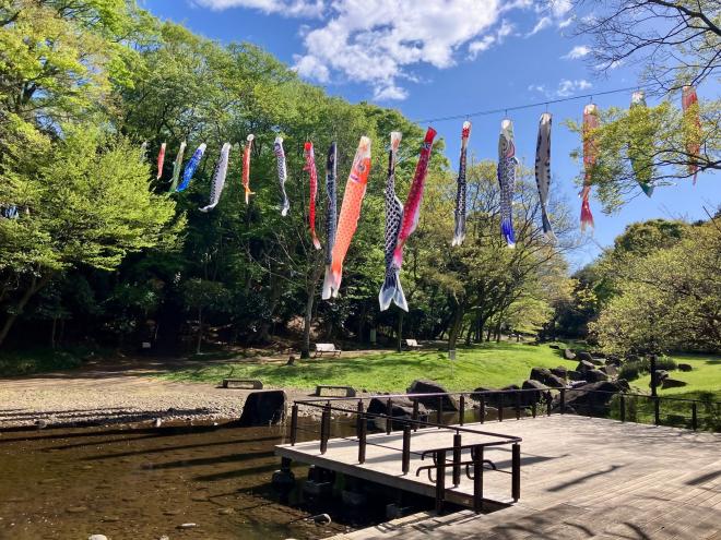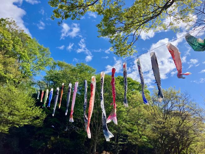渓流園の空を鯉のぼりが元気に泳いでいます。5月16日までになりますのでぜひお越しください!