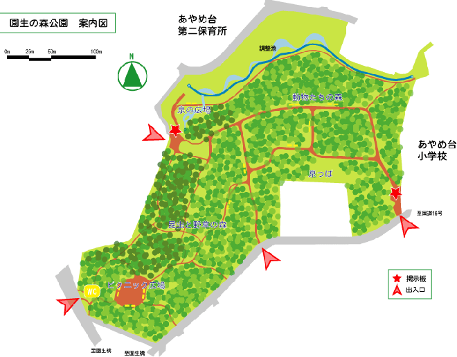 「園生の森公園」は、国道16号、あやめ台団地、あやめ台小学校、京葉道路などに囲まれた場所に位置し、市街地の中で貴重なみどりとなっています。しかし、周辺にまとまった緑地がなく、園生の森公園だけで孤立した島状の緑地となっています。