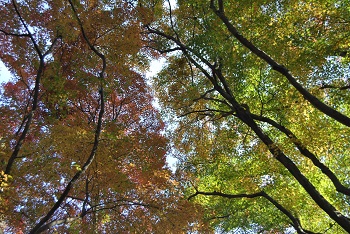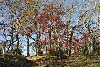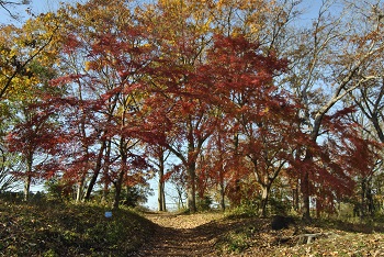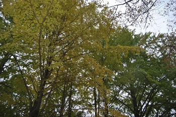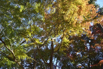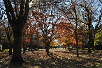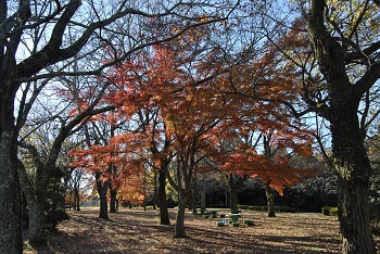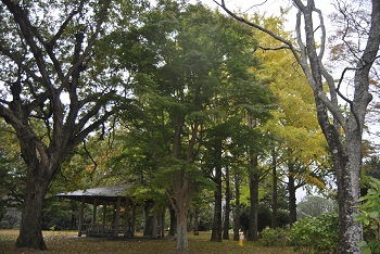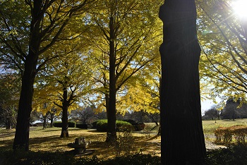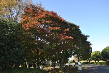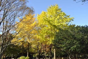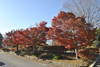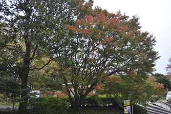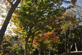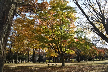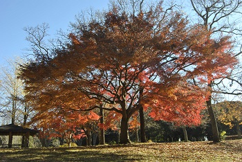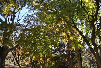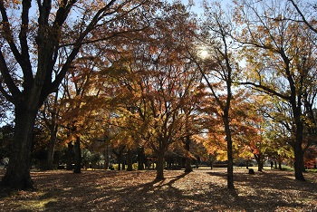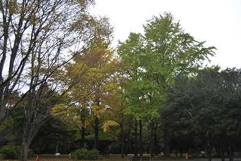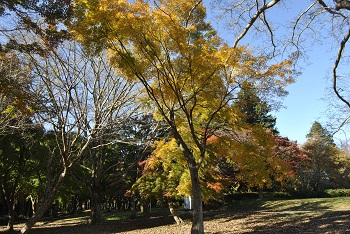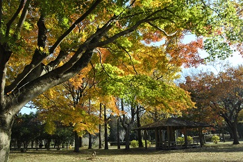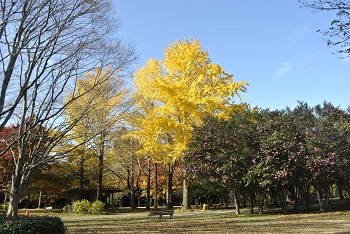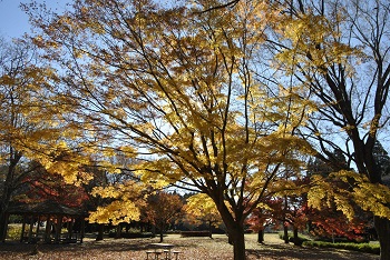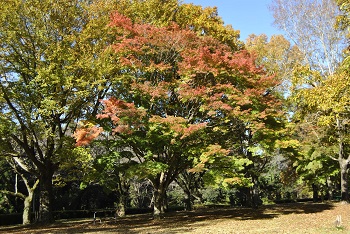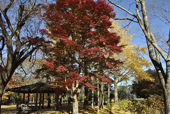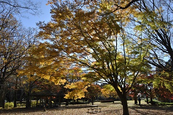 イチョウは落葉しました。市町村のモミジは上部が色あせ、落葉しているものが増えてきました。冒険広場のモミジはまだ、葉が色づいていない緑色の葉のものもありましたが、昭和の森全体では、モミジの見ごろは過ぎてしまいました。また、来年の色づきまでお楽しみに!