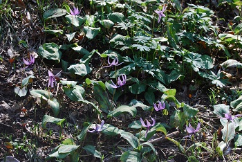 気温が低く(本日の気温9度)曇り空の元では、カタクリの花は反り返りが見られず閉じていますが8分咲きの状態です。気温が15度以上になると花の反り返りが見られます。