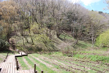 ハナショウブ園の斜面では、カタクリの花が開花し始めました。数えてみると100輪程開花していましたが、斜面をピンク色に染める程ではありませんので、見頃になるまではもう少し時間がかかると思います。