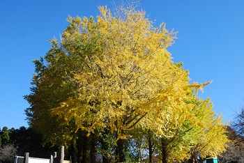 左のイチョウは落葉が進んでいますが、右のイチョウの色づきはこれからです |