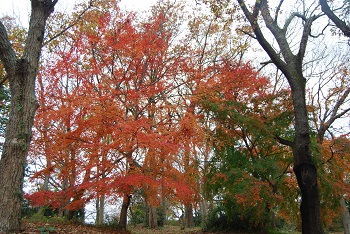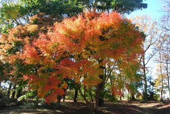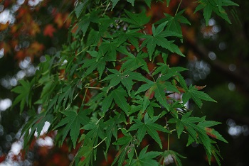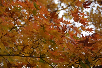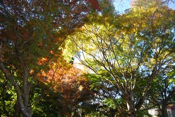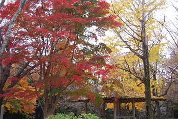 今日は、生憎のお天気で、モミジの美しさが半減してしまいました。(お天気の良い日のモミジは、太陽の光があたるととても奇麗ですよ)昨日の強い風によりイチョウは大分落葉が進んでいました。モミジも落葉したものも多いですが、これから色づくモミジもありますのでお早目のご観賞をおすすめします。